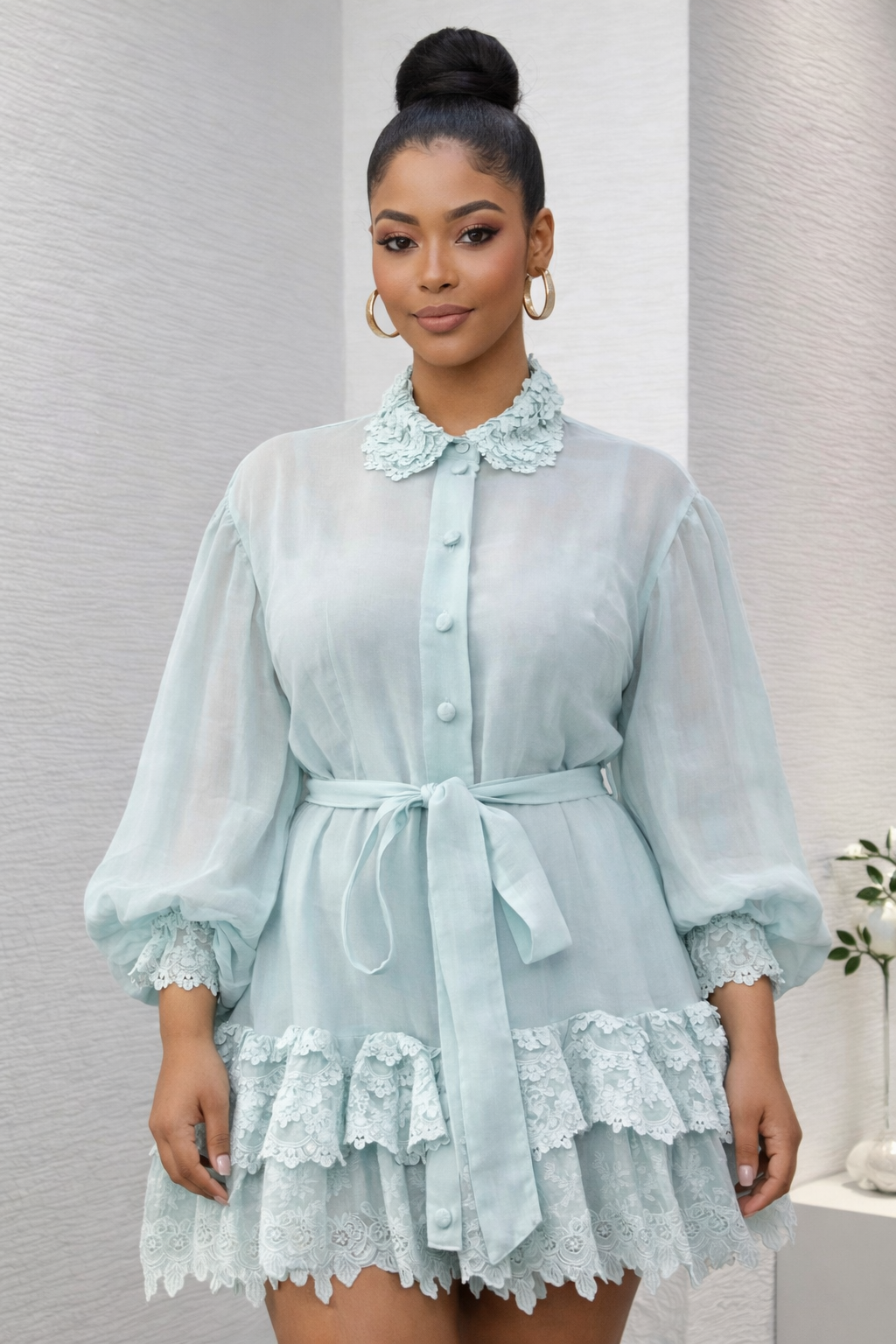 Create an Account1 piece peter pan collar laced dresses with Bishop sleeves